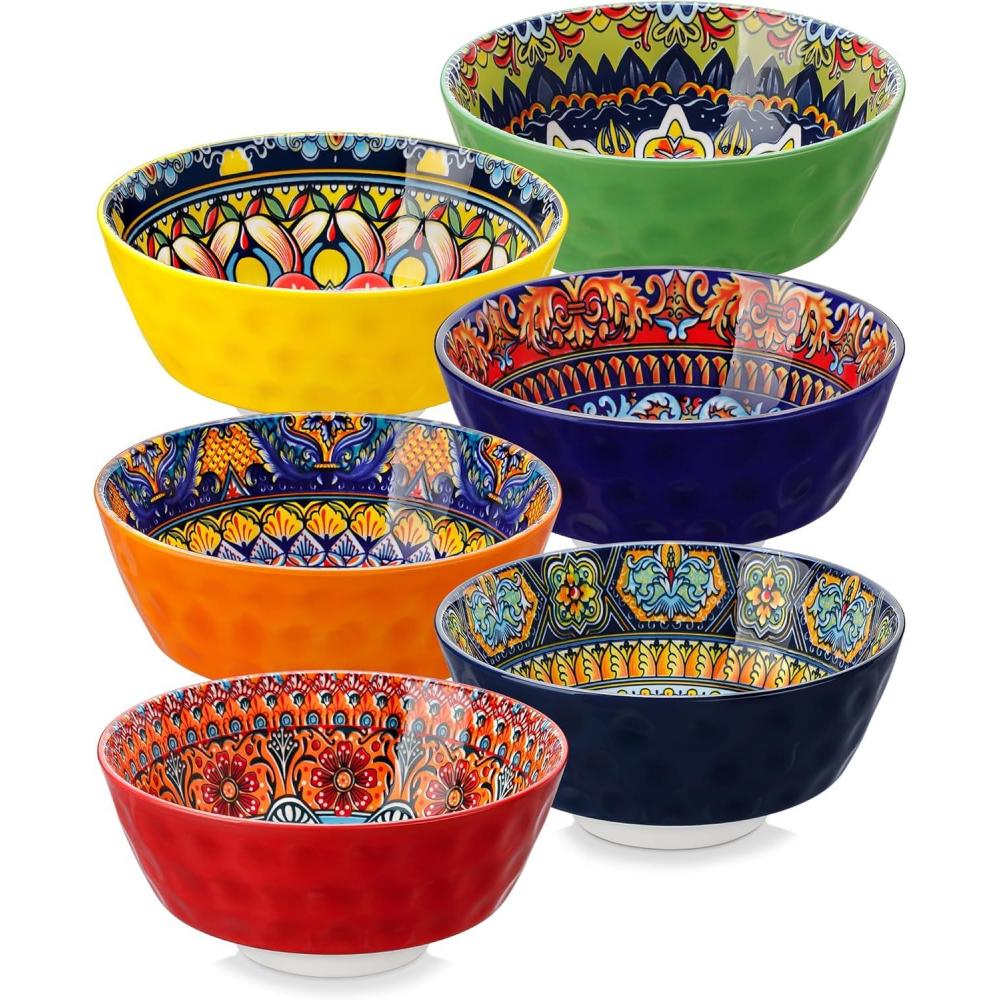 【Vibrant Bohemian Style Printed】Each Cereal bowl in this 6-piece set features a unique, artistically crafted bohemian pattern on the interior, bringing a free-spirited and joyful vibe to your table. The exterior showcases a variety of solid colors, adding a modern and colorful touch to your kitchen or dining space. Perfect for everyday meals or entertaining guests